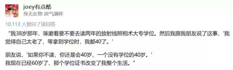 知乎上看到过一个回答:“我38岁那年,琢磨着要不要去读两年的大专学位,然后我跟朋友说了这事,我觉得自己太老了,等拿到学位时,我都40了。朋友说如果你不读,你还是会40岁,一个没有学位的40岁。我现在已经60岁了,那个学位证改变了我的整个生活”