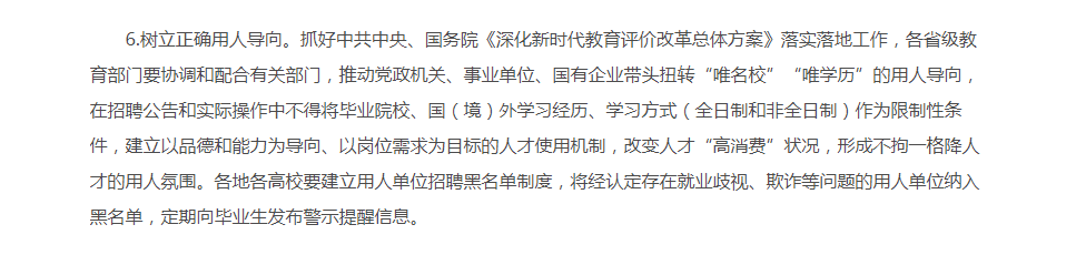 树立正确用人导向。抓好中共中央、国务院《深化新时代教育评价改革总体方案》落实落地工作,各省级教育部门要协调和配合有关部门,推动党政机关、事业单位、国有企业带头扭转“唯名校”“唯学历”的用人导向,在招聘公告和实际操作中不得将毕业院校、国(境)外学习经历、学习方式(全日制和非全日制)作为限制性条件,建立以品德和能力为导向、以岗位需求为目标的人才使用机制,改变人才“高消费”状况,形成不拘一格降人才的用人氛围。 教育部关于做好2021届全国普通高校 毕业生就业创业工作的通知
