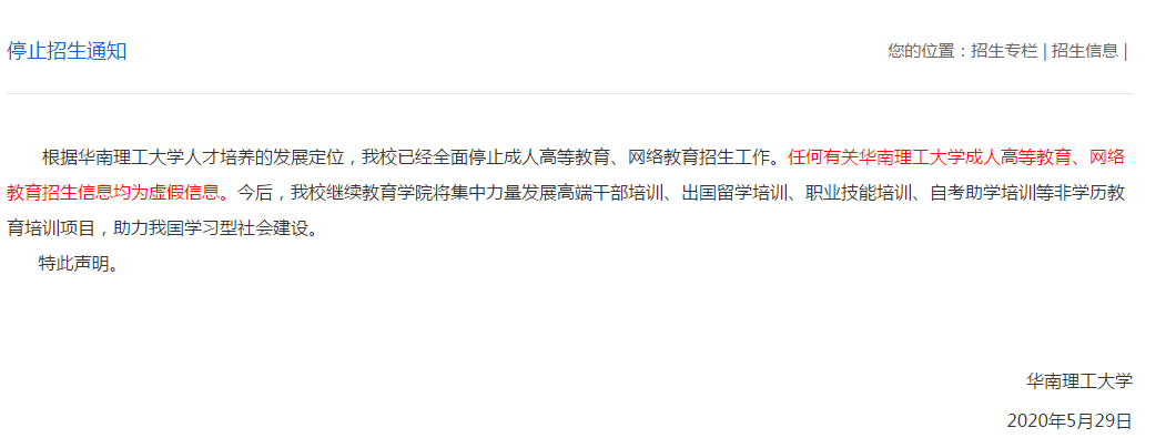 2020年5月29日发布全面停止成人高等教育、网络教育招生工作。