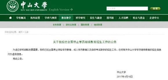 2017年4月18日中山大学公布全面停止学历继续教育招生工作。