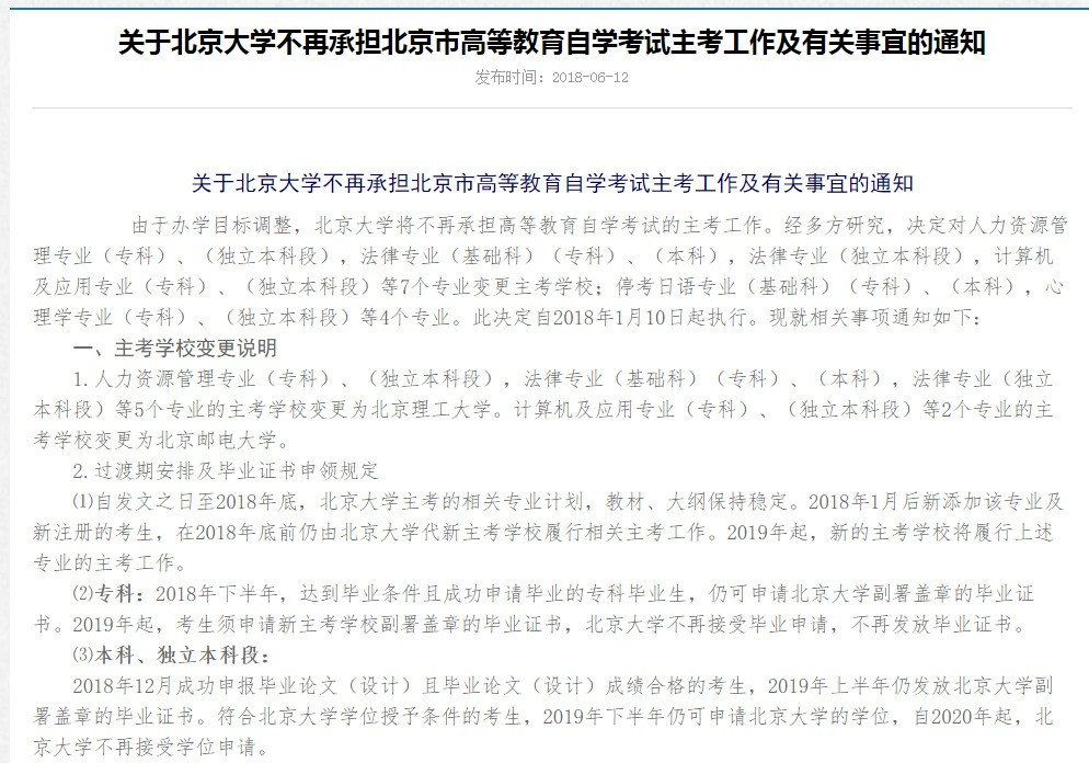 2018年6月12日发布不在承担北京市高等教育自学考试主考工作