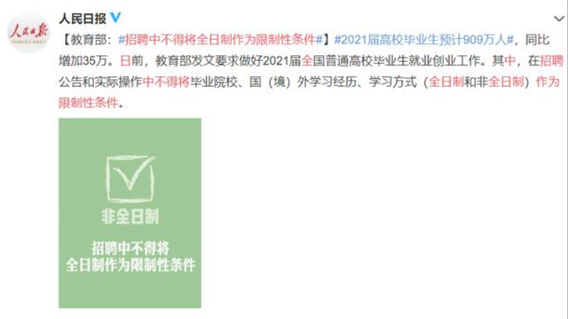 前段时间,教育部发文规定:招聘中不得将全日制作为限制性条件!
