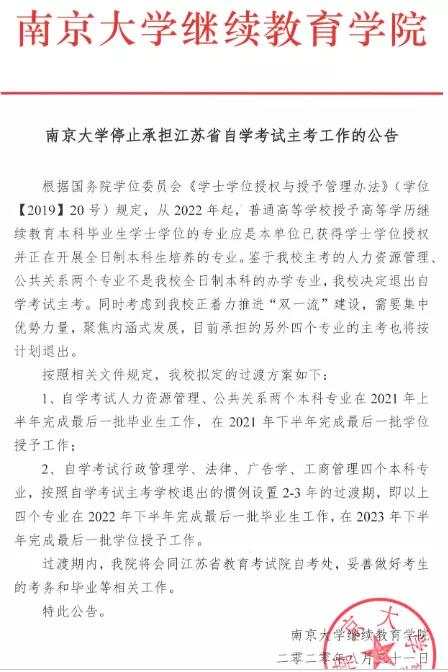 2020年8月31日,江苏教育继续学院发布公告,《南京大学停止承担江苏省自学考试主考工作的公告》