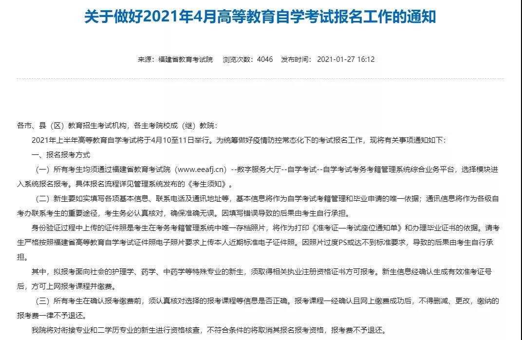 考生可于4月2日-7日登录福建省教育考试院网站打印《准考证—考试座位通知单》,并关注考试相关动态公告以及疫情防控的新要求,提前做好相应准备。
