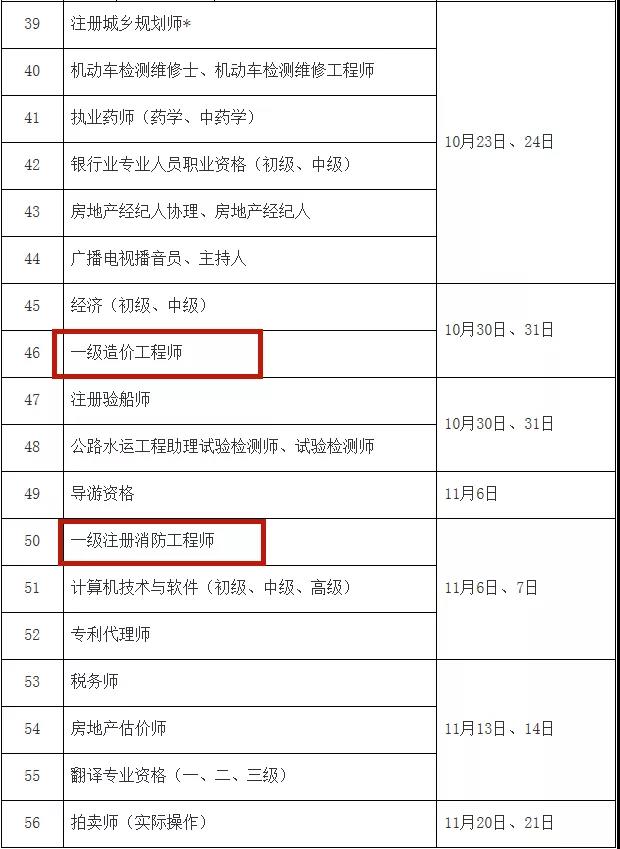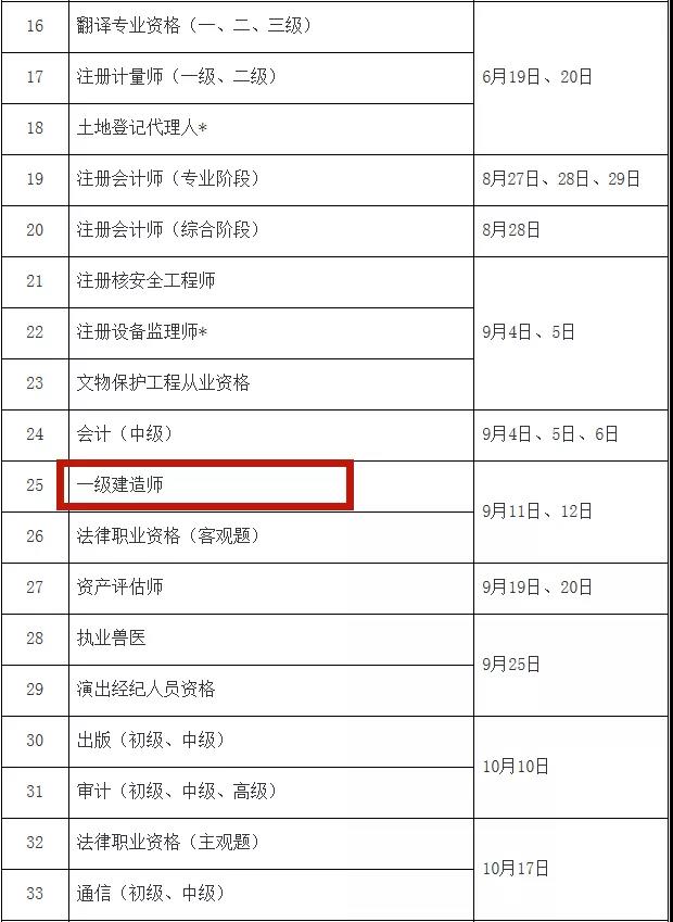 2021年度专业技术人员职业资格考试时间表出炉!其中2021年一级建造师考试时间确定为2021年9月11日、12日;一级注册消防工程师考试为11月6日、7日;一级造价师考试为10月30日、31日。以下考试时间表详细内容。