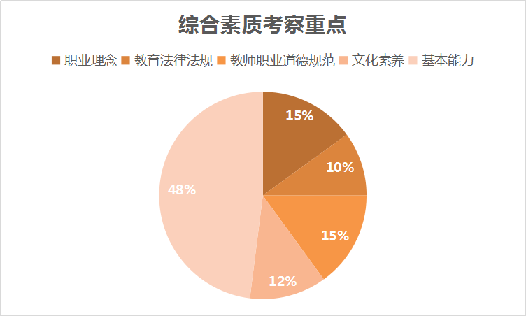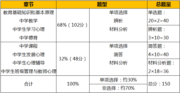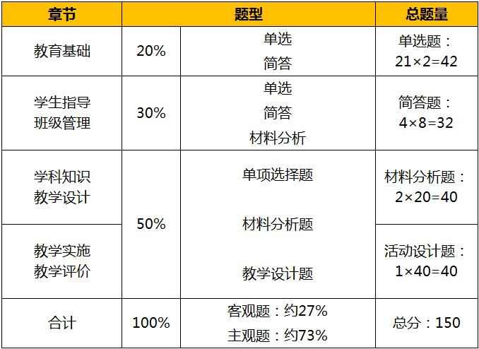 考试中所占比重比较大的主要是教育基础、教学设计、教学实施以及班级管理,大家在这几章要多下功夫。