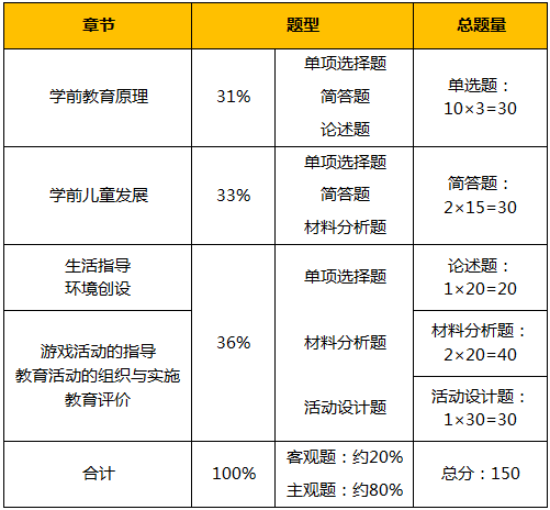 2.学前教育原理:每年大概会考查1-3道单项选择题,其中出题的重点集中在幼儿教育的概念、原则,幼儿教育发生发展中的典型事件、代表人物,主要主张等常识性知识点,多属识记类考点。